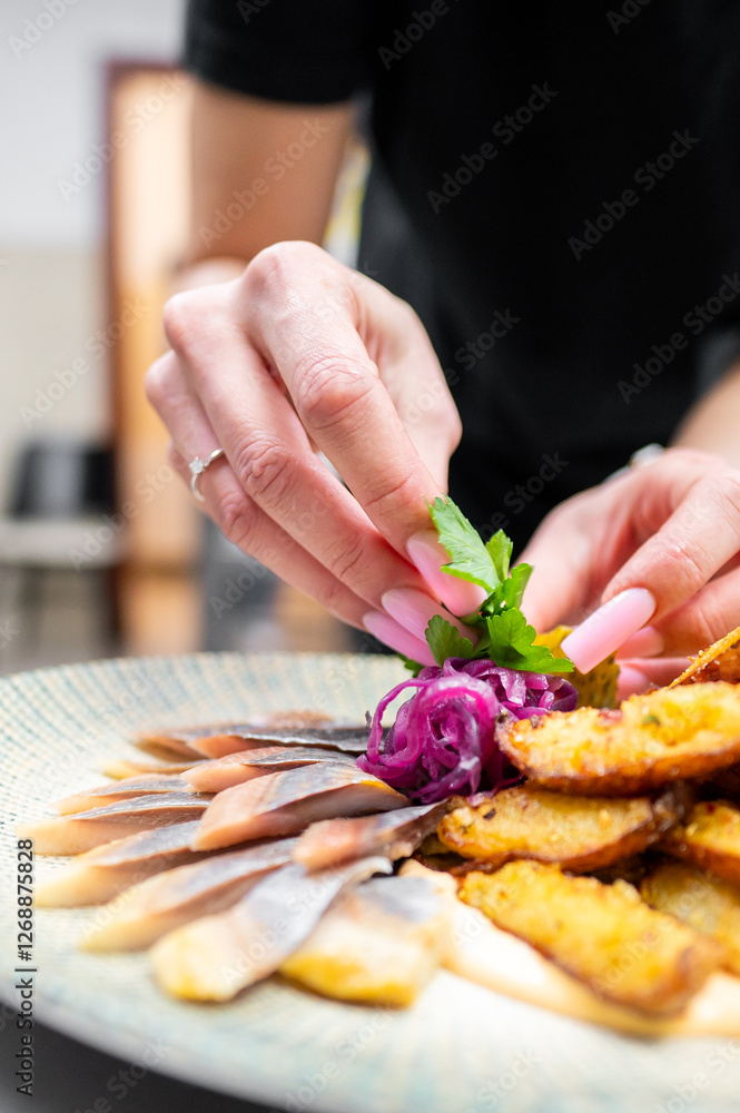 A close-up of a person's hands garnishing a beautifully plated dish with fish and fried items. Fresh herbs and purple onions add a vibrant touch to the culinary presentation.