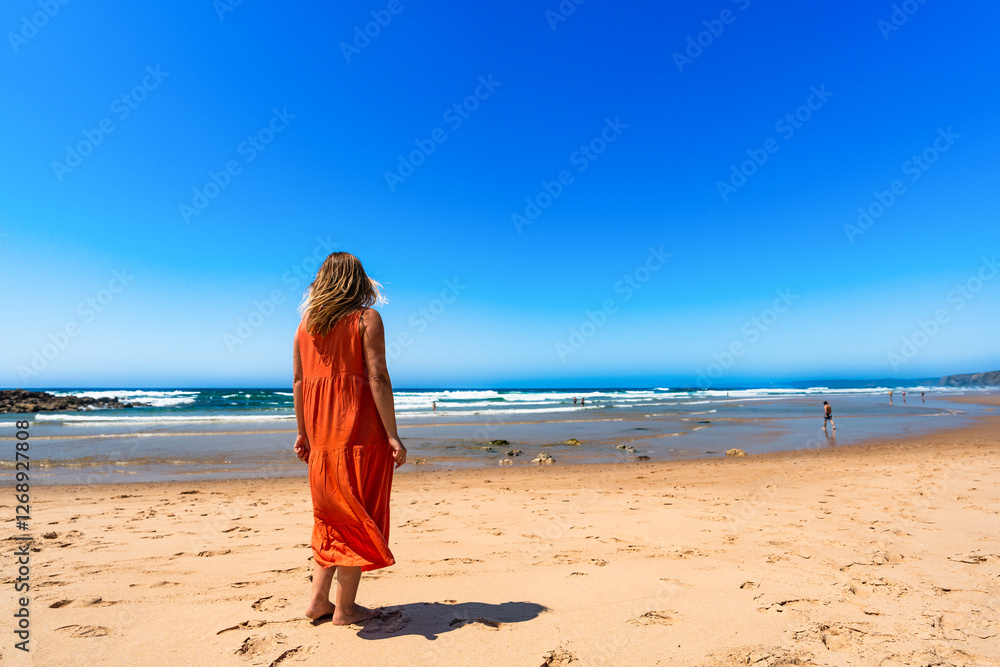 Mature blonde woman standing on beautiful sandy beach in summer. Back view