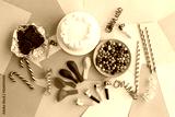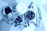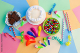 Cake, candy, chocolate, whistles, streamers, balloons on holiday table. Concept of children's birthday party. View top.