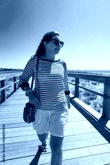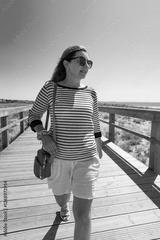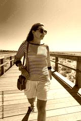 Summer vacation. Pretty middle aged woman walking on wooden promenade in seaside resort on beautiful sunny day. Front view
