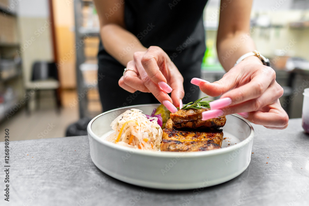 A chef garnishes a beautifully plated dish with herbs in a modern kitchen. The presentation includes grilled meat and a side of fresh salad, showcasing culinary skills and attention to detail.