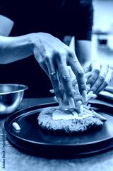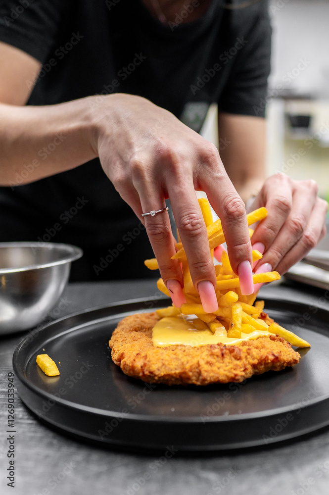A chef's hand adds crispy golden fries atop a breaded chicken cutlet on a black plate, showcasing a delicious comfort food meal preparation.
