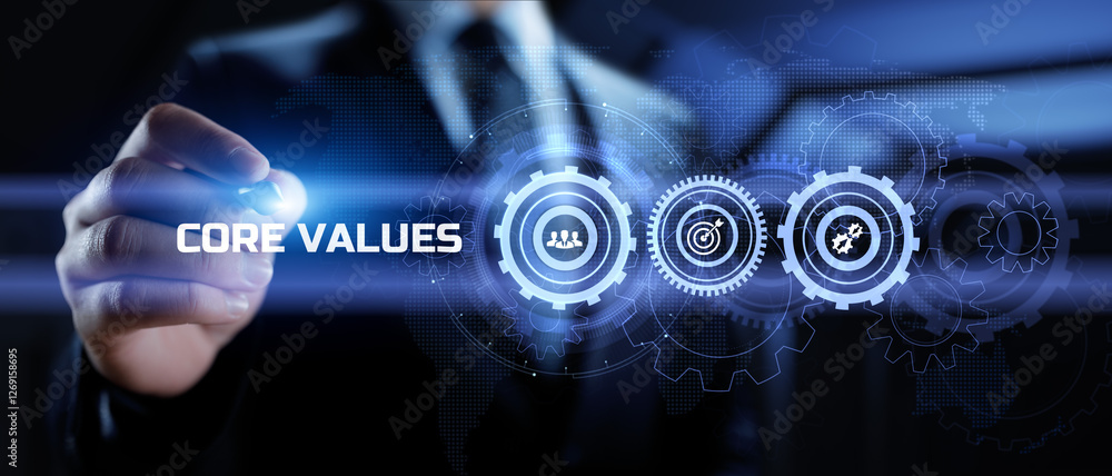 Core values Responsibility Innovation. Businessman pressing button on screen.