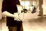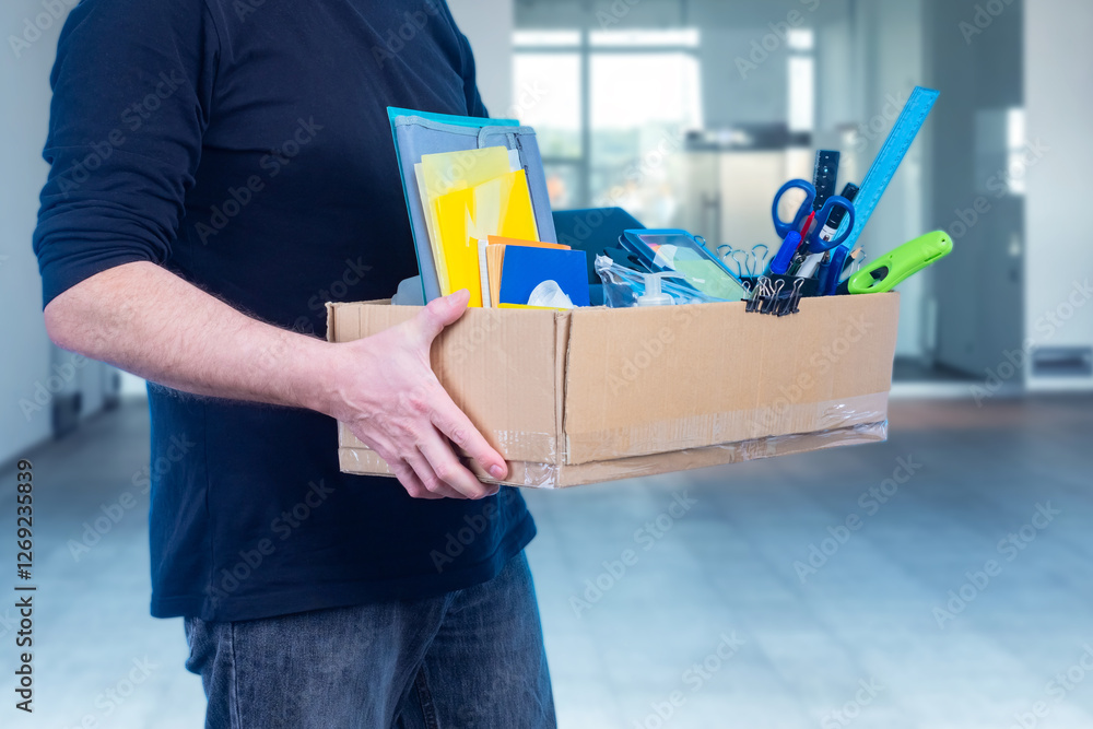 Dismissal box in hands of man. Cropped employee lost job. Dismissal box with office supplies. Fired manager leaves office. Person became unemployed due to labor market crisis. Cardboard dismissal box