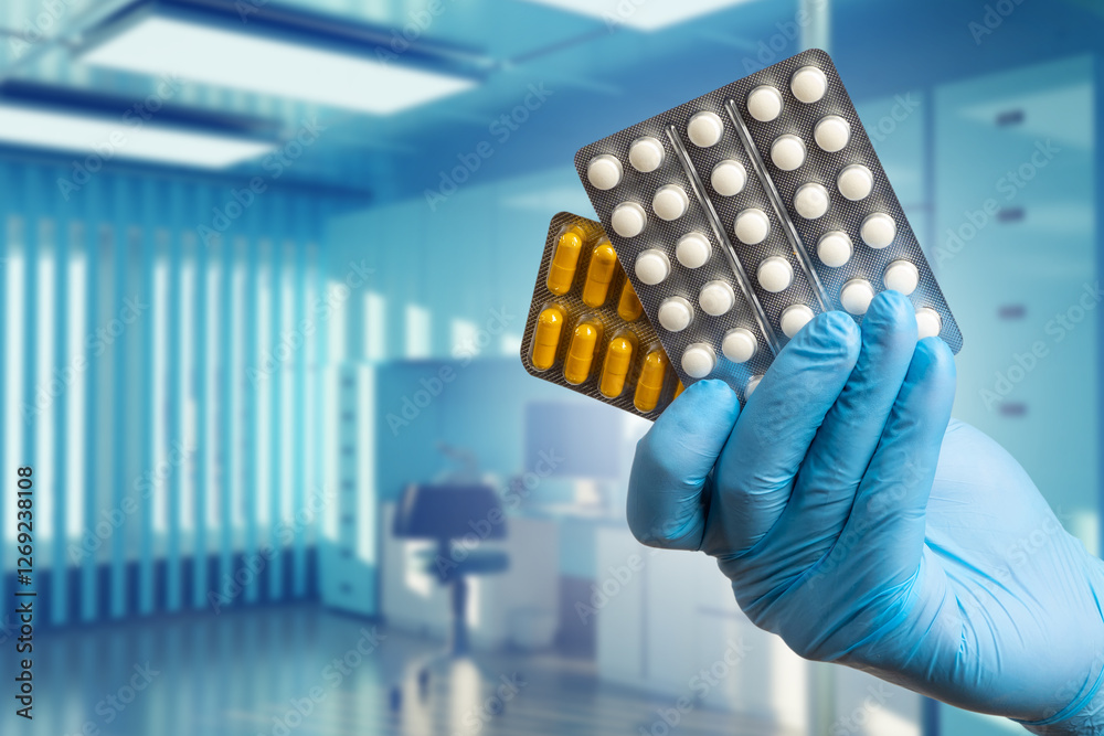 Pills for treatment of diseases. Blisters with medicine in doctor hand. Painkiller pills as recommended by therapist. Vitamins and antibiotics to improve immunity. Blurred doctor office behind pills