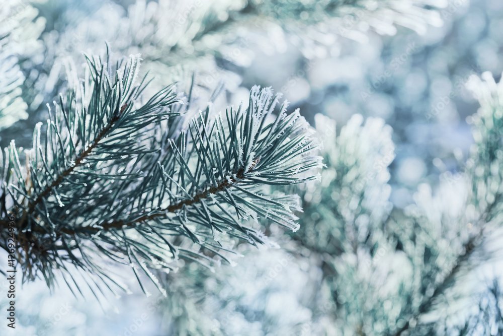 Winter background of blue pine branch in the snow and frost on a cold day. Macro nature.