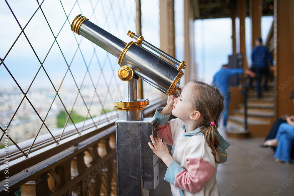 Adorable preschooler girl enjoying the view from the Eiffel tower to the Field of Mars in Paris, France..