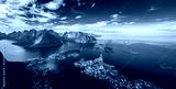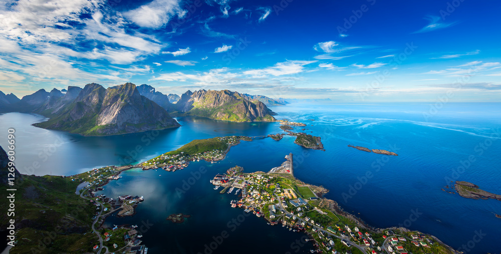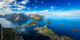 Amazing landscape of the Lofoten Islands from the top of Reinebringen Mountain with blue sky , county of Nordland, Norway.