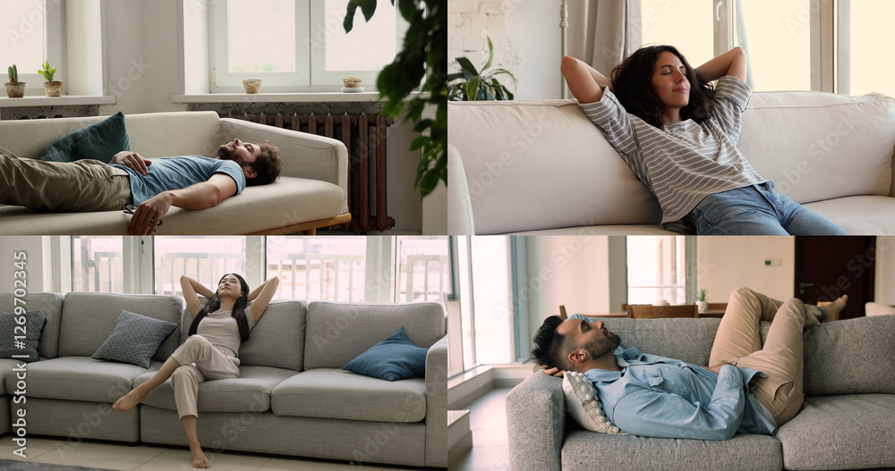Four silent millennial multiethnic people having healthy daytime nap, resting on cozy sofa in modern living room with climate control at smart home. Relaxation, fatigue relief, multiple videos collage