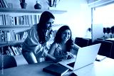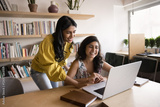 Mentorship in education. Smiling young lady university teacher tutor experienced student mentoring female mentee peer groupmate explain learning subject on notebook at library exchange ideas knowledge