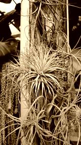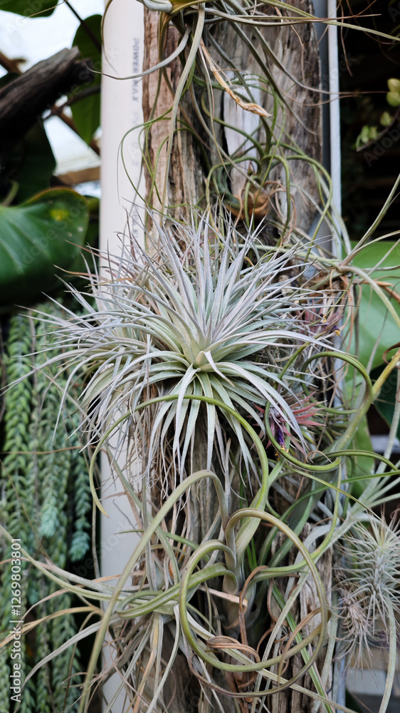 Close-up of Air Plants with Thin Spiky Leaves Growing on a Wooden Surface in a Lush Green Garden Setting with Natural Light and a Blurred Background