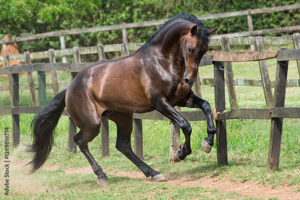 Bay lusitano stallion plays in the field