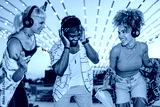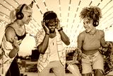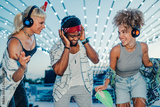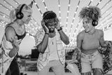 Happy friends enjoying music at silent disco festival under string lights
