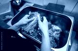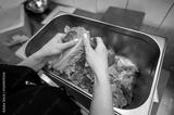 A chef prepares fresh romaine lettuce in a stainless steel container, highlighting the texture and color of the greens as hands break apart the leaves.
