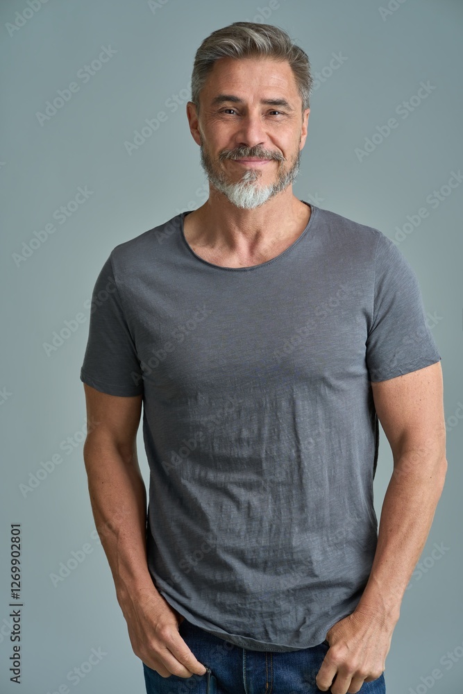 Portrait of happy casual older bearded man with gray hair smiling, Mid adult, mature age guy standing, isolated on gray background.