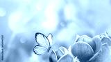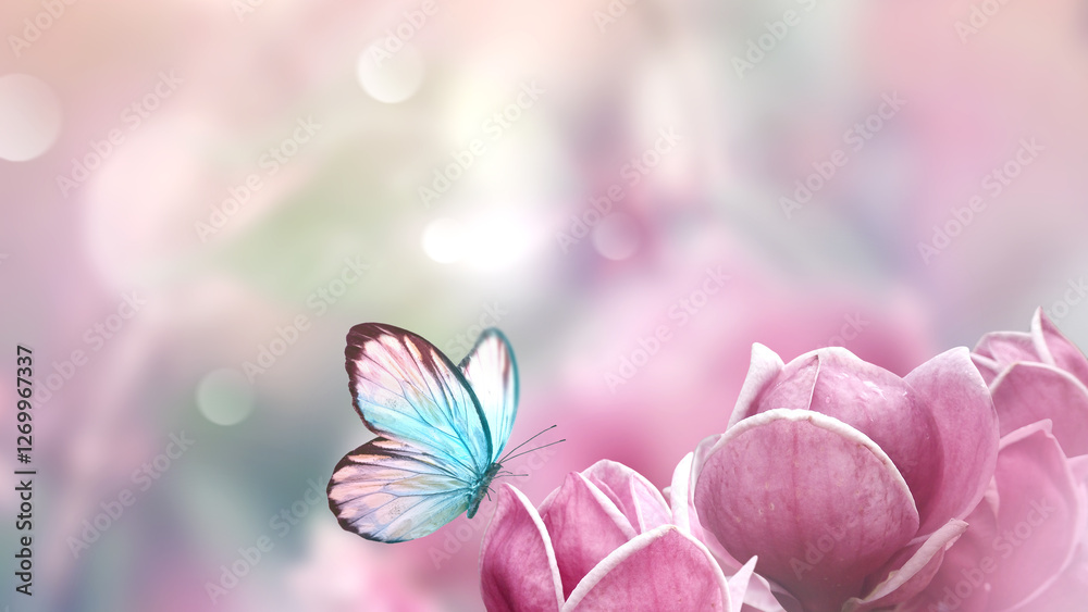 Spring background with blooming pink magnolia flowers and flying butterfly.