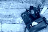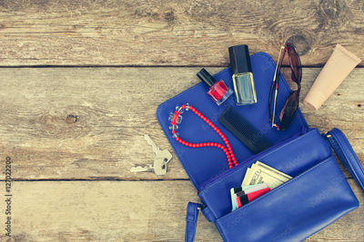 Things from open lady purse. Cosmetics, money and women's accessories fell out of blue handbag. Top view. Toned image.