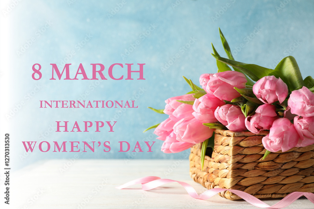 8 March, international women's day, tulips in a wicker basket on a blue background, with text