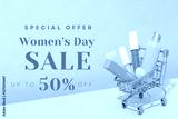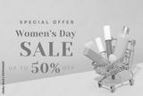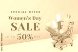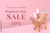 8 March, international women's day, golden trolley with cosmetics on a pink background, with text