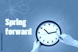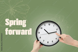 Spring Forward. Hands holding a clock, on a green background, with text.