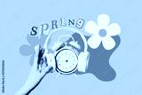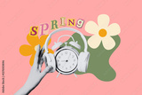 Spring Forward. Design, alarm clock with headphones and hand, on a pink background.