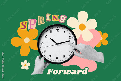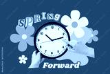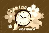 Spring Forward. Design, clock with hands and flowers, on a green background.