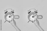 Spring Forward. Design of two clocks on a pink and blue background.