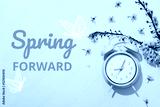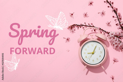 Spring Forward. Alarm clock on a pink background, with the text: "Spring Forward".
