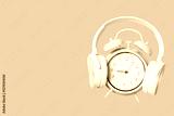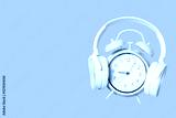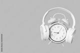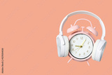 Spring Forward. Design, alarm clock with headphones, on a pink background.