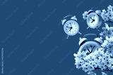 Spring Forward. Pink alarm clocks on a red background, with flowers, with space for text.
