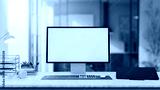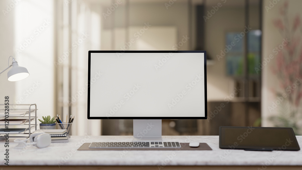 A modern graphic designer office features a computer, a graphic tablet, and decors on a desk.