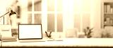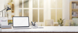 A laptop with a white screen placed on a white table with a blurry background of a living room.