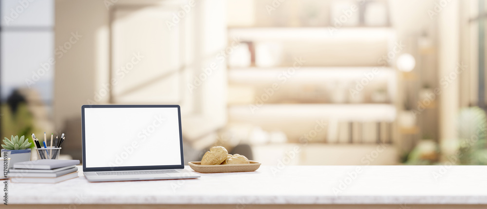 A close-up of a laptop on a white table with a blurry elegance living room in the background.