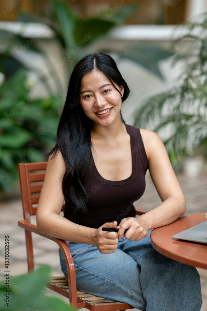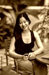 An attractive, confident Asian woman sits at an outdoor table of a cafe, smiling at the camera.
