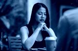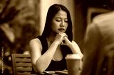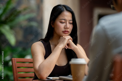 A serious Asian woman focuses on reading something on her laptop while having an informal meeting.