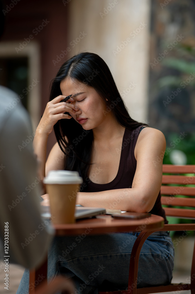 A stressed woman has a headache during an informal meeting with her colleague, receiving bad news.