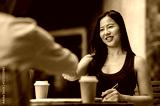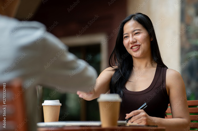 A confident Asian woman is shaking hands with her client after an informal meeting outdoors.