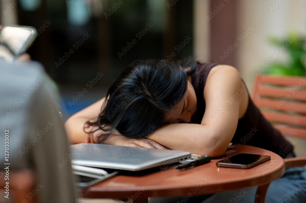 A tired, sleep-deprived Asian woman takes a nap at an outdoor table while working on her tasks.