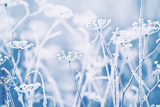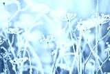 delicate openwork flowers in the frost. Gently blue frosty natural winter background. Beautiful winter morning in the fresh air. Soft focus.