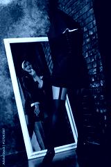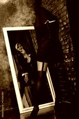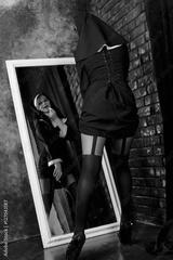 sexy nun standing in front of a mirror in stockings and color lipstick lips