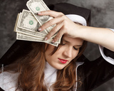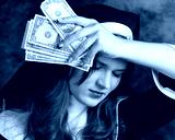 portrait of a nun holding dollar bills and a glass with alcohol on a dark background
