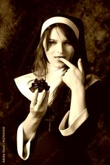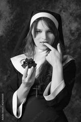 closeup attractive nun holding a cupcake and licking his finger on a dark background