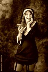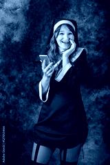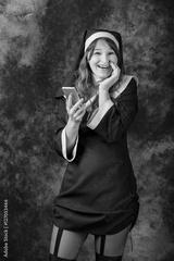 nun use return cell phone and smiling on a dark background.