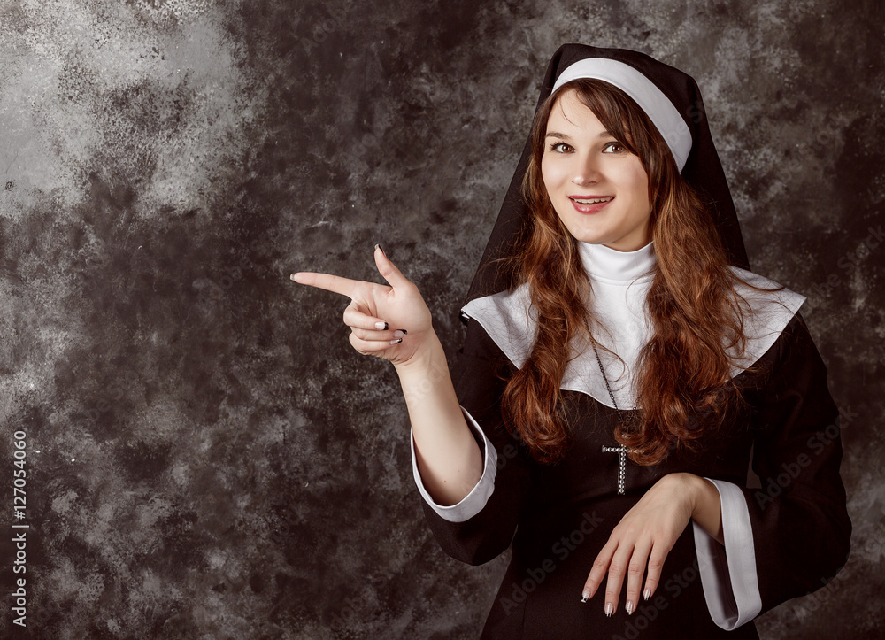 attractive nun shows the direction of finger left and right on a dark background