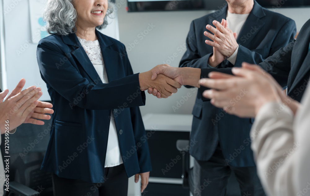 Two businesswomen shaking hands after successfully closing a deal, while colleagues clapping and celebrating their achievement in a vibrant office setting