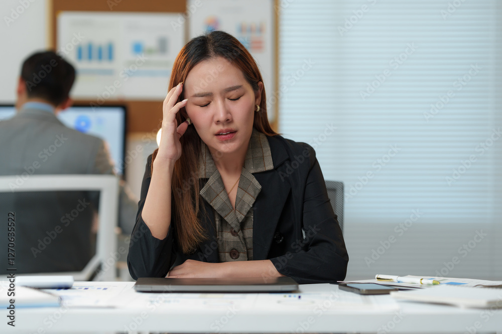 Young office worker experiencing a migraine and touching her head while sitting at her desk, showing signs of fatigue and burnout in a stressful work environment