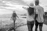 Young couple walking in the sea while smiling and enjoying summer vacation, travel together