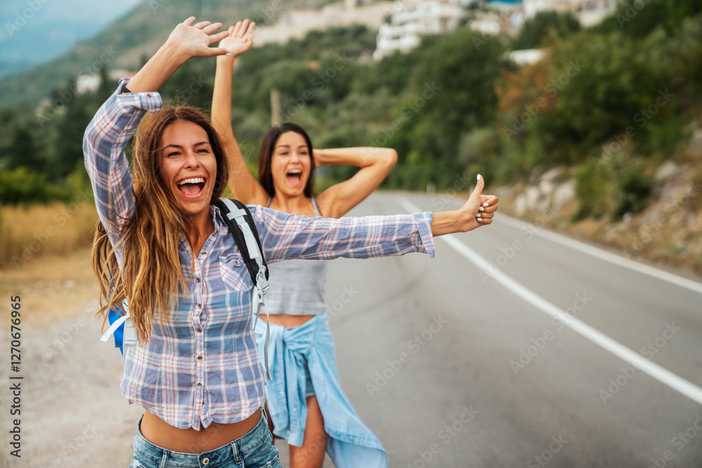 Cheerful interracial friends standing on road showing hitchhiking gestures. Tourism traveling