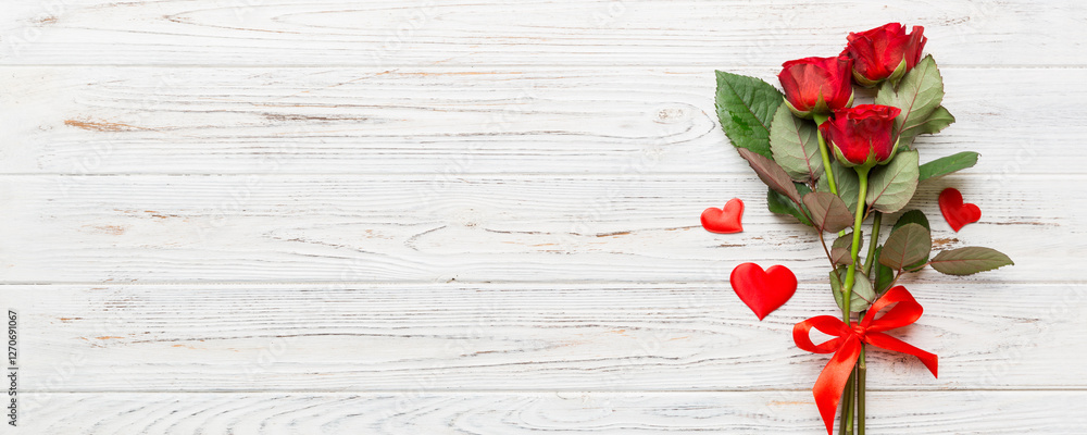 Valentine day composition with rose flower and red heart on table. Top view, flat lay, copy space Holiday concept