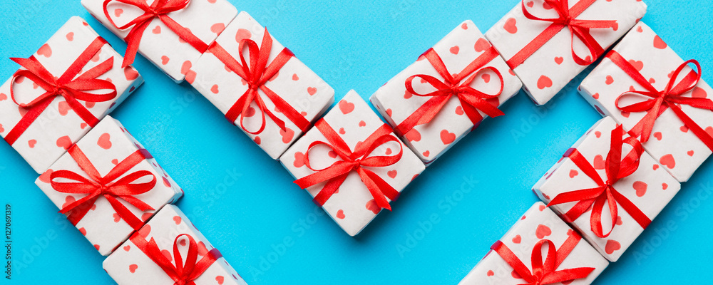 beautiful red heart frame with gift box. Valentine day background top view with copy space